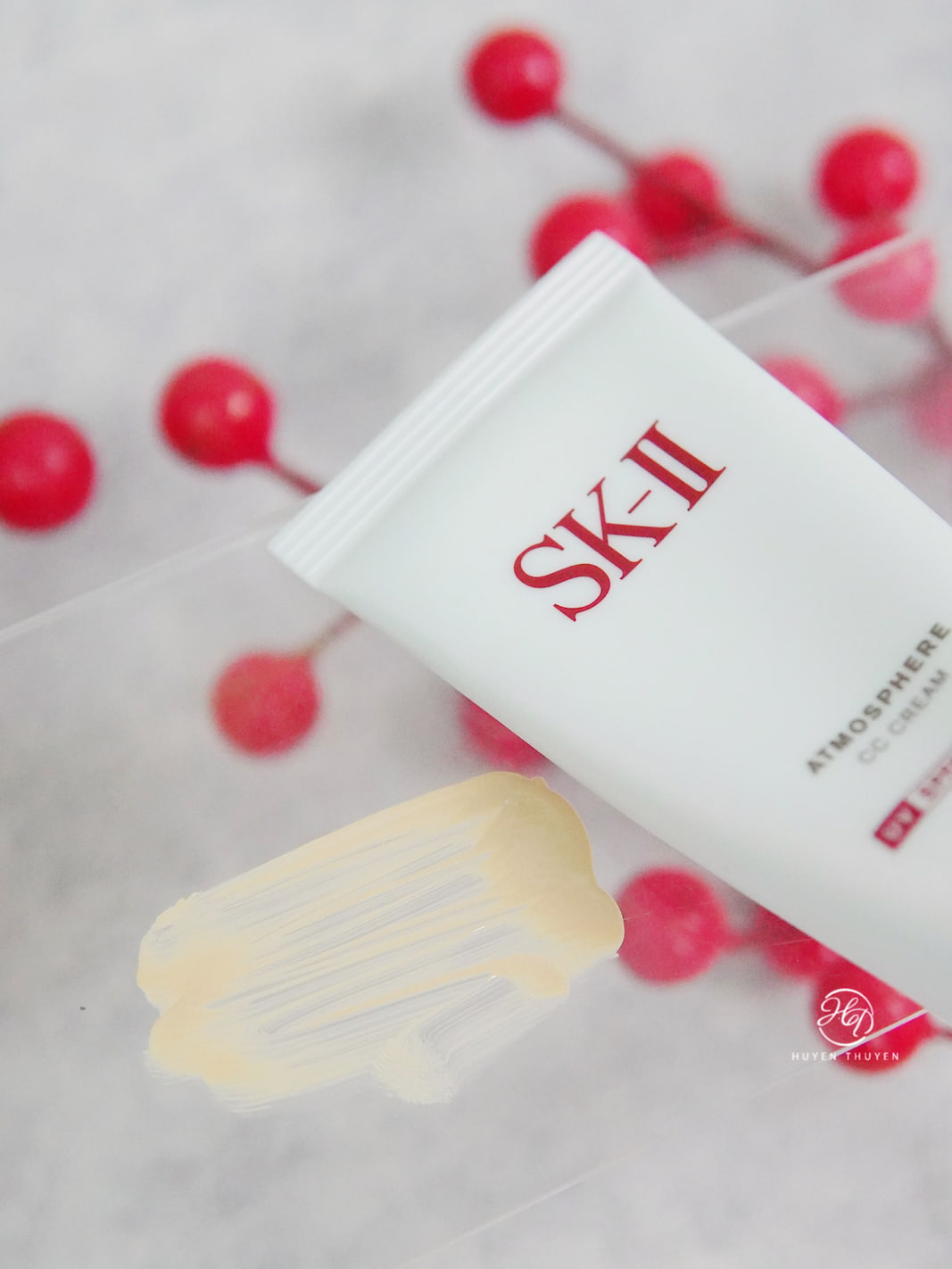 Atmosphere CC Cream có chất kem màu vàng nhạt, hơi sánh nhẹ như kem nền dạng lỏng